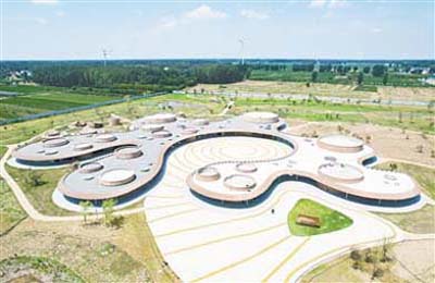 記者來(lái)到賈湖遺址博物館,映入眼簾的是古樸圓形建筑群。此建筑群整體外形像濺開(kāi)的水滴。陳列展區(qū)分為“禮樂(lè)之源”1個(gè)主題展廳和“賈湖探秘”“骨笛”“龜甲與符號(hào)”“墓葬與葬禮”4個(gè)專(zhuān)題展廳。每個(gè)展廳運(yùn)用人工智能、5G、MR、雷達(dá)投影互動(dòng)、3D動(dòng)畫(huà)等高新技術(shù),讓人們通過(guò)聲、光、電、影全方位感受賈湖文化的巨大魅力。