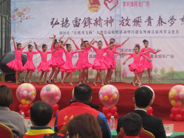 在啟動儀式上舉行“童心繪沙澧”主題活動,20多名留守兒童/殘疾兒童與青年志愿者共同在風箏上繪制沙澧美景,并一起放飛風箏;一個16的漯河小伙子用6個月時間,精心制作了長達33米的巨型大風箏,放飛在商業廣場的時空;中學生表演的舞蹈節目,美奐美倫,特別受到廣大志愿者和留守兒童/殘疾兒童們的歡迎。