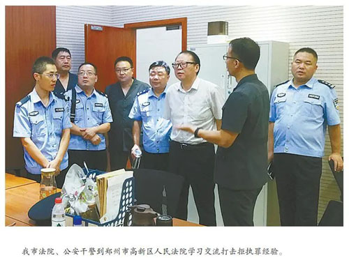 警務室成立以后,市中級人民法院黨組成員、副院長任國云牽頭組織成立了由執行局、刑事法庭和公安民警共同參加的學習先進經驗小組,分別到焦作市溫縣人民法院、商丘市柘城縣人民法院、鄭州市新密市人民法院等全國、全省執行工作先進單位考察學習,汲取打擊拒執罪先進經驗、對照工作找差距、彌補執行短板,針對我市實際,制訂了一套“法院+公安”的協同作戰方案,并建立了信息共享、溝通反饋、組織協調、督辦檢查等執行聯動工作機制。