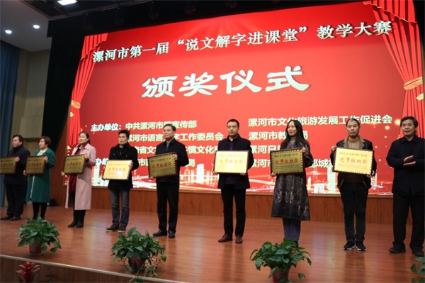 11月29日,由中共漯河市委宣傳部、漯河市文化旅游發展工作促進會,漯河市語言文字工作委員會,漯河市教育局、河南省文字學會許慎文化研究會、漯河市日報社聯合舉辦的漯河市第一屆“說文解字進課堂”教學大賽總決賽及頒獎典禮在漯河市郾城中學舉行。郾城中學東校區教師常賽男獲得“說文解字進課堂”教學大賽初中組一等獎,郾城區實驗小學曹艷紅獲得“說文解字進課堂”教學大賽小學組一等獎,郾城區教育局、郾城中學均獲得“說文解字進課堂”教學大賽優秀組織獎
