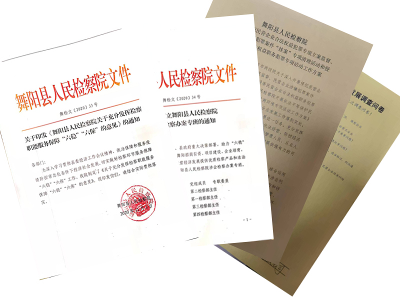 尤其在今年疫情防控背景下,舞陽縣檢察院立足檢察職能,向社會公開承諾積極做好服務保障企業復工復產工作,組織開展了嚴懲妨礙企業生產經營犯罪專項活動等五個業務專項活動,主動上門為企業送法、送服務,深入了解企業遇到的問題,對公司法務難題進行釋法析理、出謀劃策,真正讓企業家感受檢察力量。