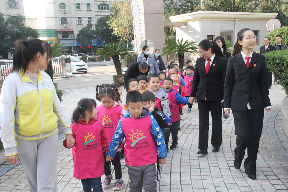 (中院法官和陽光雨露幼兒園小朋友在大樓門前留影)