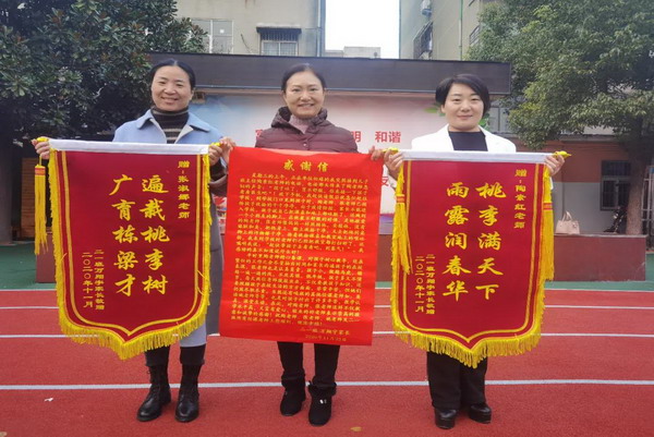 據了解,一天大課間,一個男生因不舒服突然嘔吐,課桌上、地上、書包上、鄰桌腳上和自己身上,都是嘔吐物,兩位老師馬上跑過去詢問情況,第一時間給家長取得聯系后,及時清理嘔吐物,家長來后,一切清理完畢,給家長一個干干凈凈的孩子,家長很是感激,特意把繡有“遍栽桃李樹 廣育棟梁才”、“桃李滿天下 雨露潤春華”的錦旗和感謝信送給兩位老師,一股暖意和家校情誼無以言表。面對家長的感激,兩位老師說:“這只是我們的工作本分而已......”。簡單的一句話是外國語小學所有教師真實的寫照。