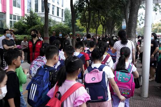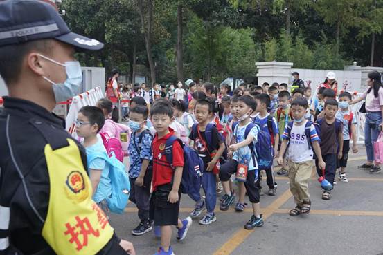 18點15分,錯峰放學的三、四年級學生按照南北兩隊分別從學校南北兩個大門走出,行至各自的接送點。18點30分,最后放學的高年級學生也分成兩隊走出校門,18點40分,全校學生全部有序離校,沒有擁堵現象發生。