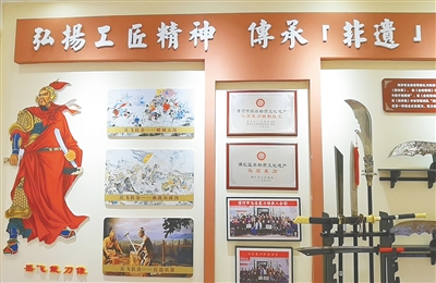記者看到,展示墻上有馬店菜刀第五代傳承人寧俊生、王新正、寧振江和寧朝倫的簡介和照片。