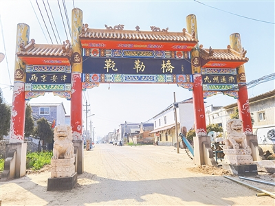 近日,記者到革乞勒橋村采訪時(shí)看到,該村有一座古風(fēng)跨街牌樓立于村北口。牌樓正面腳下,有兩只威風(fēng)凜凜的石獅。牌樓上方寫有“革乞勒橋”三個(gè)金色大字,兩側(cè)寫有“兩京要津”“九州通衢”八個(gè)字。