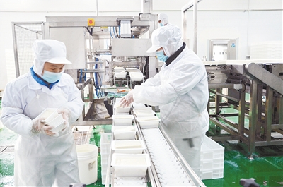 7月2日上午,南街村集團清真食品公司豆腐生產(chǎn)車間的職工正在包裝麻婆豆腐。 記者 張曉甫 攝