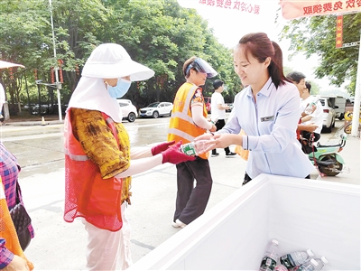 小區物業管理人員向環衛工人送冰涼的礦泉水。