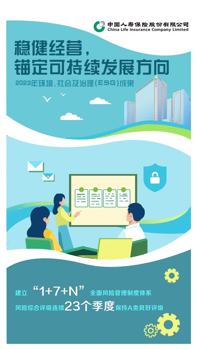 與此同時,中國人壽積極應對“償二代”二期規則下的風險綜合評級指標調整,開展風險綜合評級數據管理工作,公司嚴度風險管理能力自評估工作,并認真進行整改和完善。2023年公司風險綜合評級保持良好評級,已連續23個 A類。