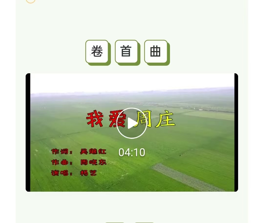歌曲《我愛周莊》詞作者源匯區文化館吳繼紅,曲作者是原市音樂家協會主席周曉東,演唱者源匯區實驗學校音樂老師楊藝。歌曲融入鄉村特色,運用了中國民族調式,將周莊村的秀美風光、村民勤勞勇敢的精神風貌充分展現。歌詞富有詩意、旋律優美,唱出了周莊村鄉村振興的美麗樂章,唱出了老百姓對當下生活的滿足和對美好未來的期待,更唱響了周莊人的自豪感,凝聚了鄉情,成為鄉村文化的新符號。