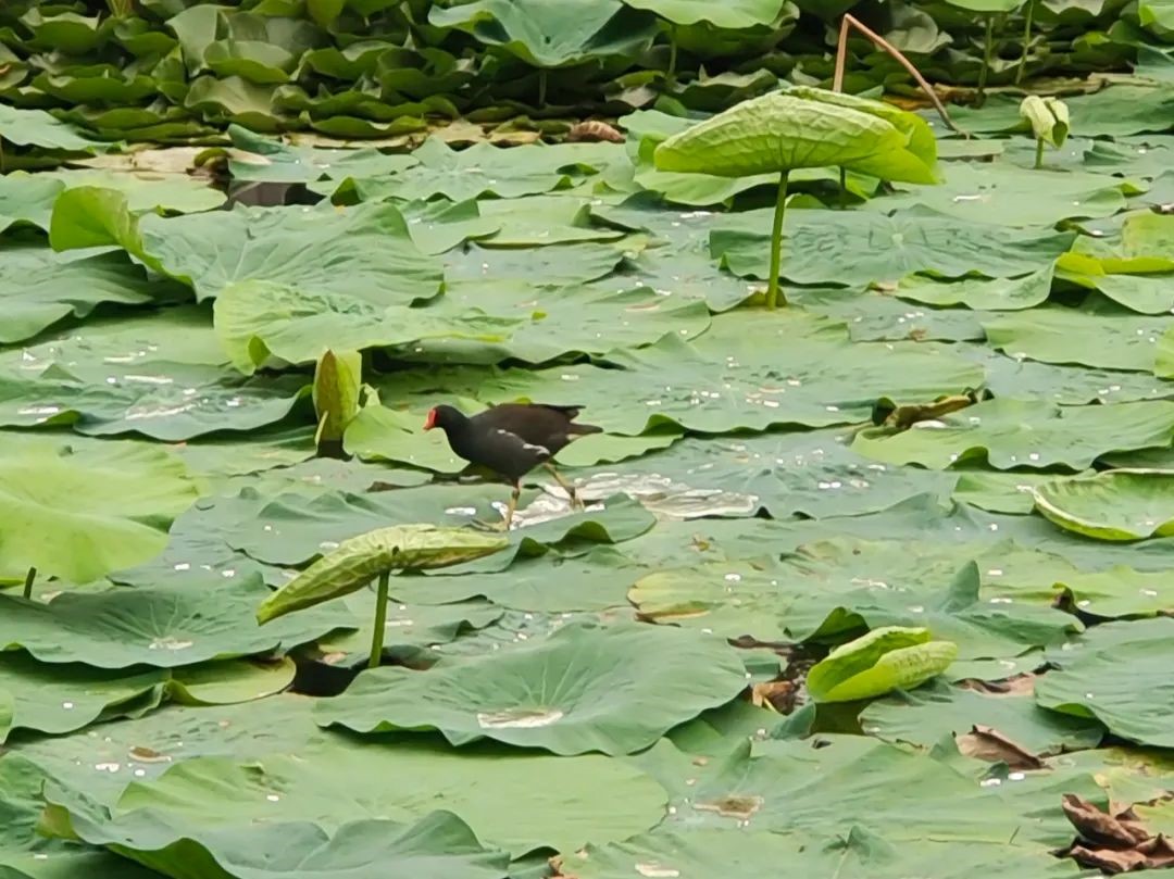 精細管養:織就湖面生態錦緞。“一日六巡兩清” 是養護人員養護日志里的工作準則。每天9點前,養護人員就會駕駛打撈船完成第一次湖面漂浮物清理,到了15點還會進行第二次復檢,力求讓落葉、雜物打撈干凈。通過優化水體循環系統,湖內已形成"荷花—微生物—水鳥"的微型生態鏈:荷花根系固定淤泥、凈化水質,為魚蝦提供庇護;水草適度生長為鳥類提供天然食物,鳥兒橘紅色腳掌劃開水面的畫面,已成荷塘靈動一景。
