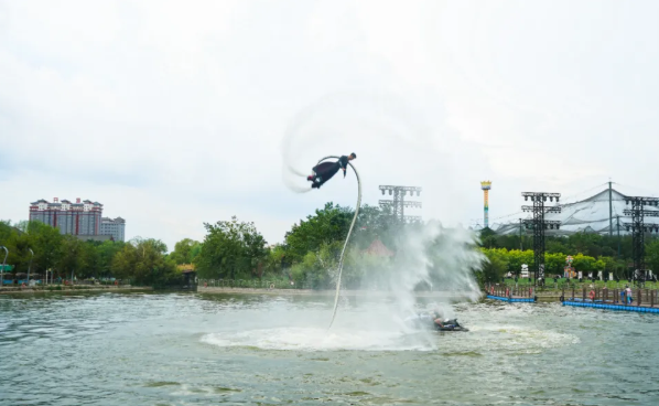 水上表演更是精彩絕倫。《獨竹水上漂》節目中,表演者們腳踩楠竹,在水面上輕盈滑行,仿佛在水上飛舞,引得觀眾們驚嘆不已。《水上飛人》的表演者們借助噴水裝置在空中翻轉騰挪,如同超人般翱翔于水面之上;而《水上火壺》則將傳統藝術與現代科技完美結合,火光與水花交相輝映,震撼的視覺效果讓觀眾們忍不住發出陣陣喝彩和尖叫。鳳棲湖劇場內,大型舞臺劇《時空奇緣》的現場排練預演同樣精彩,演員們精湛的表演和動人的故事引得觀眾掌聲雷動,沉浸其中。