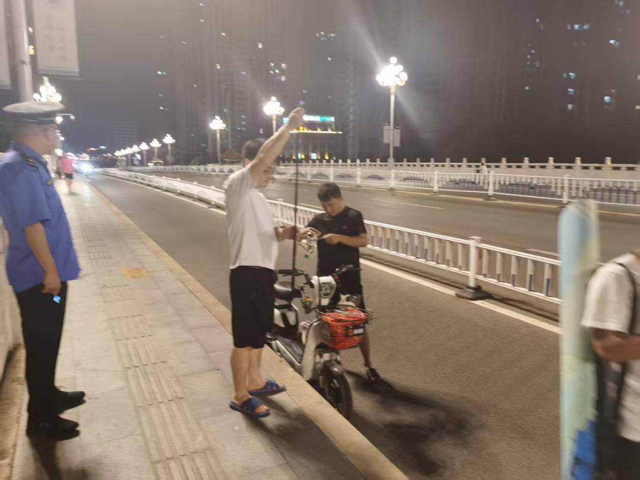 “晚上橋面光線不好,來回過往的行人和非機動車輛也多,您在這兒垂釣實在是不安全啊,趕快收竿回家吧。”8月3日20時許,在漯河市金山路沙河橋上,經開區城市管理綜合行政執法大隊大隊長曹陽帶領夜間執法人員在轄區范圍內開展橋面垂釣治理行動。