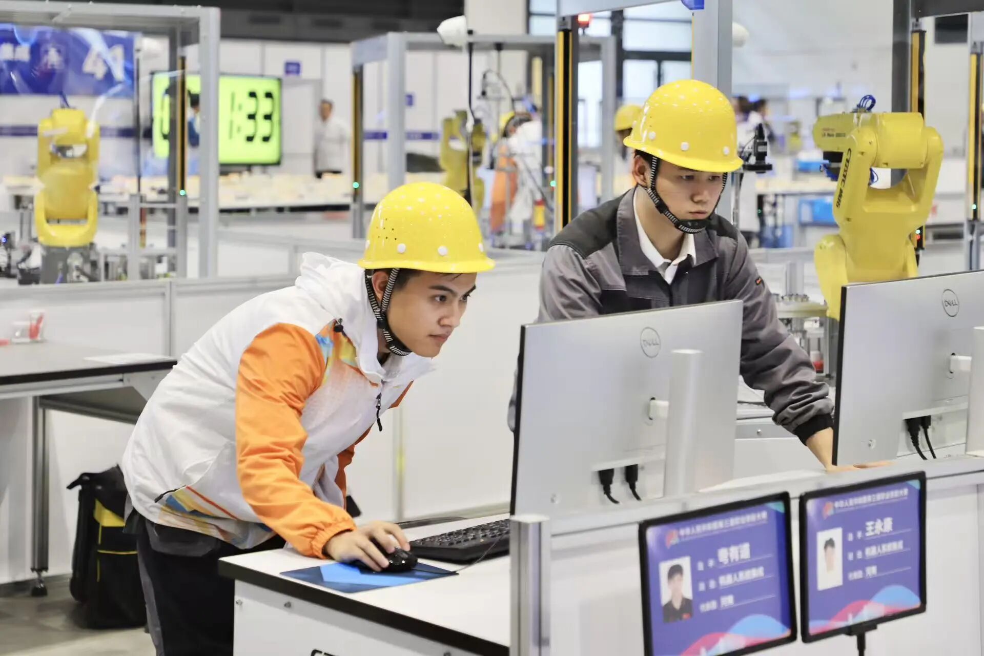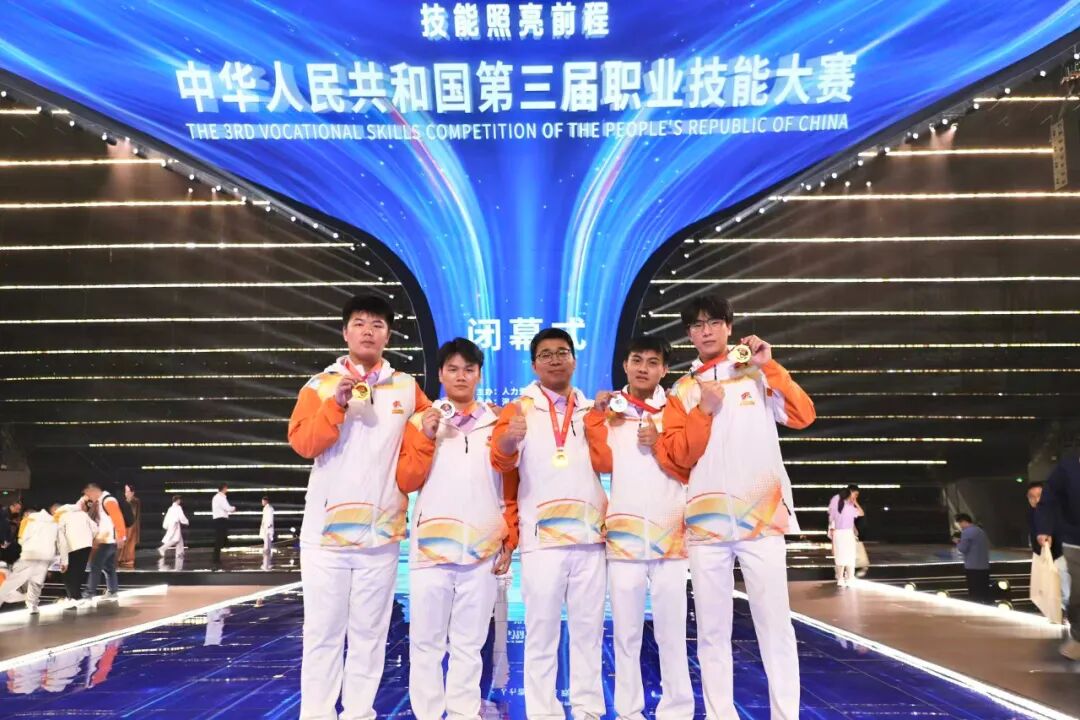 中華人民共和國第三屆職業技能大賽閉幕式上,自主移動機器人(世賽選拔項目)金牌獲得者楊奇瑞、介明鑫,工業視覺系統運維(國賽精選項目)金牌獲得者王華磊,機器人系統集成(世賽選拔項目)銀牌獲得者彎有道、王永康上臺領獎。