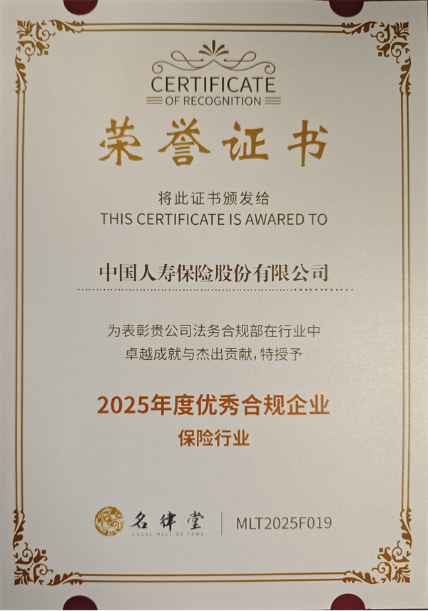 近日,在國內法律行業交流平臺名律堂組織的“2025年企業合規先鋒榜”評選項目中,中國人壽保險股份有限公司(以下簡稱“中國人壽”,股票代碼:601628.SH,2628.HK)榮膺保險行業“2025年度優秀合規企業”。
