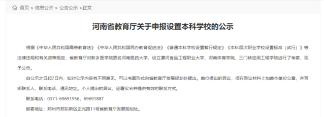 剛剛,河南省教育廳發(fā)布關于申報設置本科學校的公示,其中提到,省教育廳對