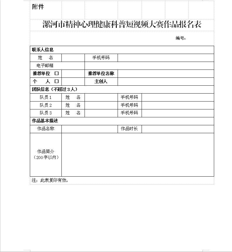 附件:漯河市精神心理健康科普短視頻大賽作品報名表