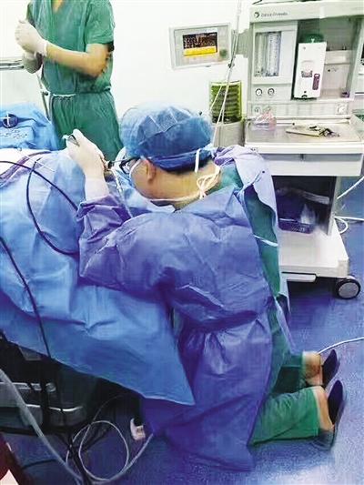 3月15日,該患者被推進手術室。因為患者聲帶有腫物,需要在支撐喉鏡下手術。“對患者進行麻醉后,為了更好地暴露手術視野,看清聲帶腫物,我只能跪在地上進行手術,因為只有跪姿時手術最方便,看到的視野最清晰。”劉世鋒解釋說。
