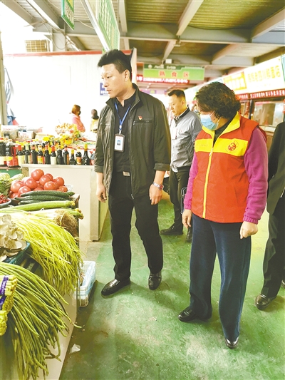 王斌(左)在遼河路一農(nóng)貿(mào)市場(chǎng)督查工作。