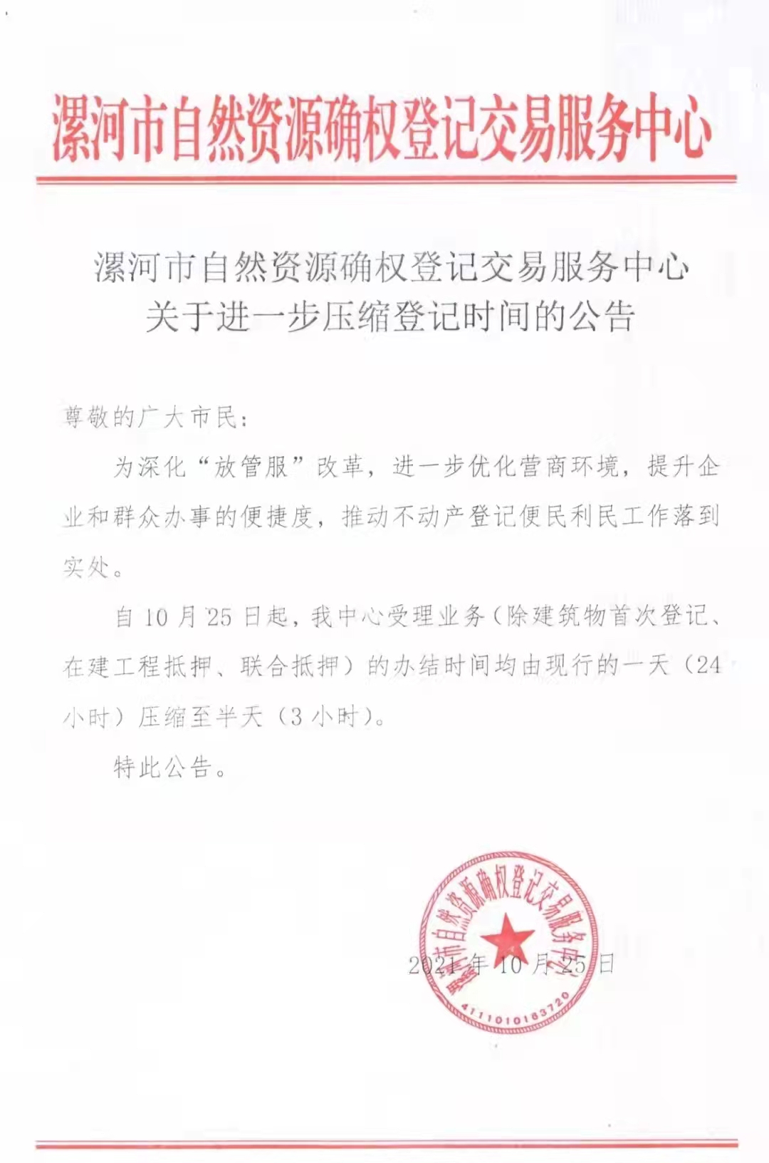 進一步優(yōu)化營商環(huán)境,提升不動產登記各項指標,提高辦事效率和服務質量,漯河市自然資源確權登記交易服務中心刀刃向內,持續(xù)推進深化“放管服”改革,以提升服務能力作為工作的著力點,以提高群眾滿意度為出發(fā)點,主動再次壓縮辦理時限,為企業(yè)和群眾提供更加高效、優(yōu)質、滿意的服務。自10月25日起,受理業(yè)務(除建筑物首次登記、在建工程抵押、聯(lián)合抵押)的辦結時間均由現(xiàn)在的24小時壓縮至3小時辦結。(通訊員:李文豪 李苗苗)