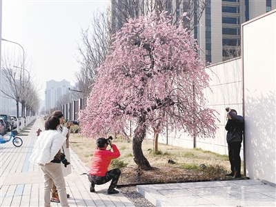 3月14日,在市區王屋山路蘇荷象灣壹號小區門前,兩株盛開的龍梅形成兩團巨大的粉色花簇,吸引不少市民圍觀拍照。