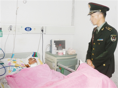 凌偉走到病床前,說起了戰友們對董亞奇的想念,囑咐他要堅強,祝他早日康復(如圖)。隨后,凌偉將戰友們為董亞奇捐的1.4萬元錢交給他的父親。