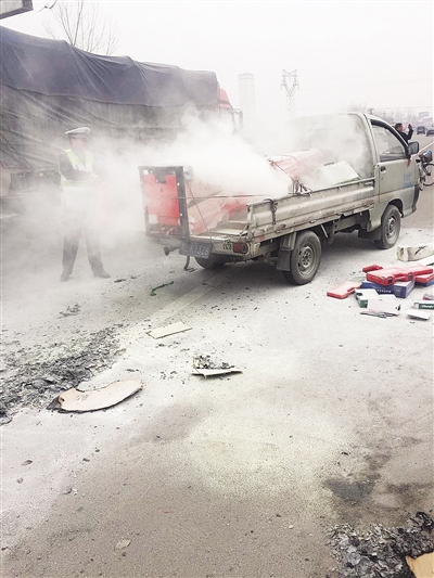 送貨車途中起火 民警急忙上前撲救