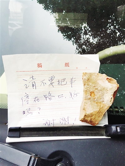 記者注意到,該車的擋風玻璃上有半塊磚頭,磚頭下方壓著一張字條。字條上寫著“請不要把車停在路口,好嗎?謝謝!”