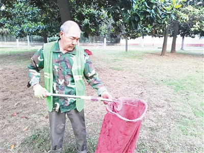 “已經做園林工人3年了,這個撿樹葉的工具是我自己摸索出來的。”袁全水一邊拿著這個1米多長的鐵桿,一邊向記者介紹。
