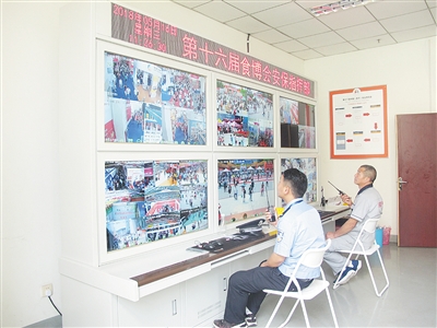 5月16日上午,記者在市科教文化藝術中心監控室看到,安保人員正在監控屏幕前用對講機和外圍警力進行調度工作。