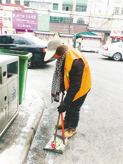 2月10日上午,室外氣溫很低,天空飄著雪花,記者在市區黃河西路見到了正在保潔路面的環衛工人肖中周。皮手套、耳暖、圍巾、帽子,雖然他全副武裝,可仍抵不住這冬日的嚴寒,臉頰被凍得通紅。他告訴記者,凌晨4點他就起床到達了自己負責的路段,開始打掃路面。過年期間,為了保證路面的干凈整潔,他和負責該路段的另一名環衛工輪流值班。