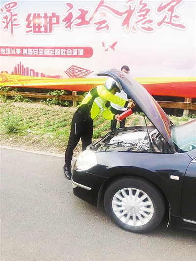 “看到他的車著了火,我就帶著摩托車上的滅火器和同事陳凱一起趕了過去。將火撲滅后,又把電瓶線拆掉,防止危險發生。”市交警支隊秩序管理大隊騎警中隊騎警陳彬說,事發時,他和同事陳凱正在附近執行任務。