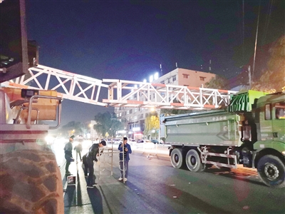 不一會兒,救援人員趕到現場,在限高桿附近擺放警示標志,提醒過往車輛和行人小心。隨后,救援人員找來一輛挖掘機,把鏟斗升起,托著搖搖欲墜的限高桿,防止其墜落。然后,救援人員對限高桿進行修復。