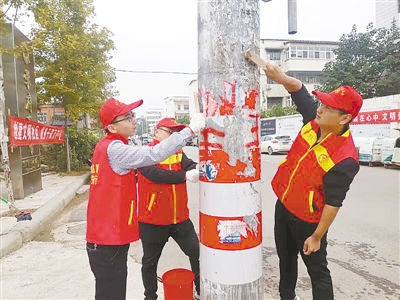 10月16日,臨潁縣人民法院組織志愿者走進轄區(qū)銀河家園小區(qū)開展志愿服務。圖為志愿者在清理電線桿上的小廣告。王 波 攝