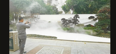 走近美景,記者看到了錯落有致的假山、精心布局的綠植、小石子鋪成的石徑,以及不斷噴發出的水霧,真是一道美麗的風景。