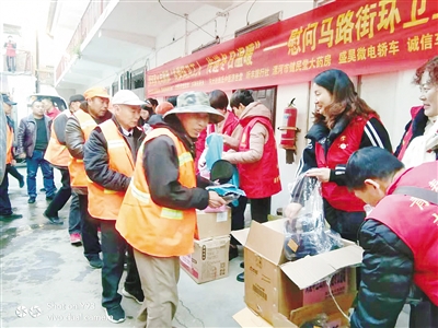 12月5日是國際志愿者日,我市志愿者來到源匯區馬路街環衛站,為環衛工人送上口罩、耳暖、手套和毛巾等物品。記者 朱 紅 攝