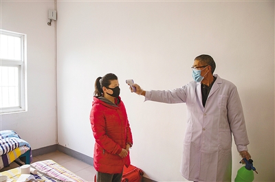 3月2日下午,在漯河市救助站二樓女區,吃過午飯,余旺梅像往常一樣在房間內休息,看手機上關于疫情進展情況,然后測量體溫。余旺梅是一名月嫂,有時候,她還會看看書,或者練習一下按摩手法,為以后找工作做準備。