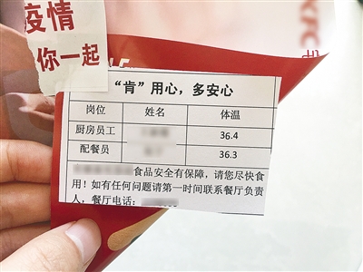 (記者 李林潤)菜品制作人是誰?配餐員是誰?他們今日的體溫是多少?近日,不少市民發現,在打包食品的袋子上或者外賣軟件上,附有一張“安心卡”,讓人看了心里特別踏實。