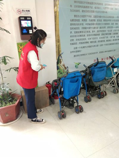 10月5日,市神州鳥園景區工作人員對景區公共物品進行消毒,做好疫情防控,倡導文明旅游。