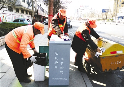 3月14日,召陵區環衛工人在金山路北段清潔環衛工具。本報記者 胡鴻麗 通訊員 劉春賀 攝