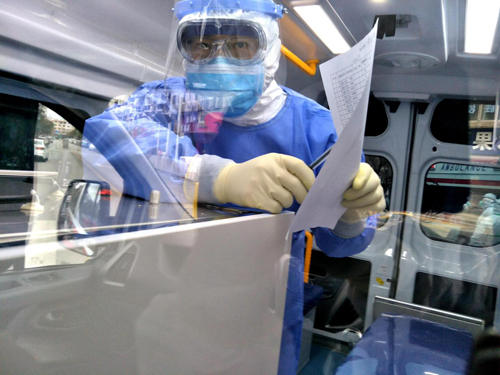 下午接到新的任務(wù),其中需要轉(zhuǎn)運(yùn)一位女性患者。剛剛開車,她的電話就響了起來。董晶兵護(hù)士就提醒她,因?yàn)檐嚿线€有其他患者,在車上請(qǐng)保持安靜,最好不要打電話。她看了看手機(jī),說家里有一個(gè)一歲半的兒子剛斷奶一星期多都沒見了,是家里打的電話,說著說著就哭了起來。同車的患者了解她的情況后表示理解,一致同意讓她接了電話。董晶兵看了看她的轉(zhuǎn)診信息,年齡才33歲,比自己大一歲。聽著她和家人交談的話語,董晶兵也想起了自己的孩子。兒子比她孩子小兩個(gè)月,昨晚視頻還叫爸爸了。看著眼前的場(chǎng)景,董晶兵一下子實(shí)在沒忍住,淚水瞬間流了下來。