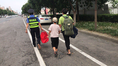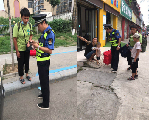 此時,楊靜和馬晨光在轄區(qū)內(nèi)正巡查至燕山路(人民路-漓江路段),發(fā)現(xiàn)路邊一中年婦女背著大包小包領著一男童焦慮地左顧右盼,兩人立即上前了解情況。經(jīng)交談得知,這對母子因為從沒來過漯河,所以一下車就迷路了,又擔心又害怕,怕錯過報名時間。看到時間緊迫,楊靜、馬晨光向母子簡單詢問了學校的名稱,因母子二人說不清楚學校具體地址,只好邊走邊問,最終安全將母子二人送達學校。同時將回去的乘車路線向小馬媽媽叮囑清楚。