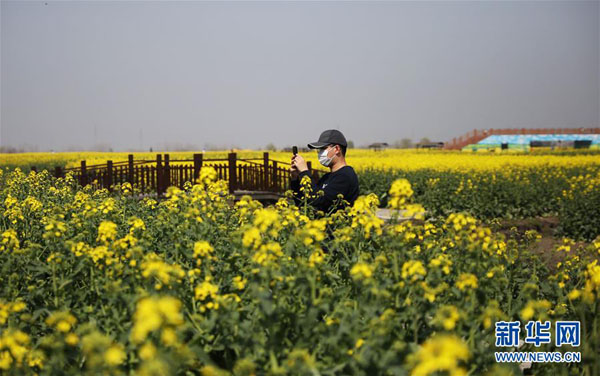 3月18日,游客在江蘇省興化市千垛景區拍照。 近日,正值江蘇省興化市千垛景區萬畝油菜花盛開期,金燦燦的油菜花在水道圍成的垛田上形成一片片金黃色的“花海”,形成了“河有萬灣多碧水,田無一垛不黃花”的壯觀景色。 新華社記者 李雨澤攝