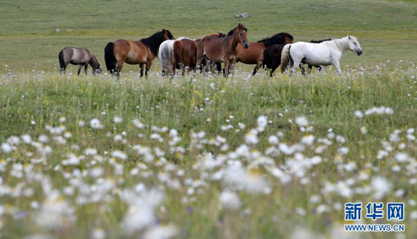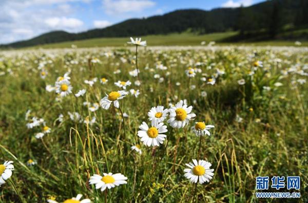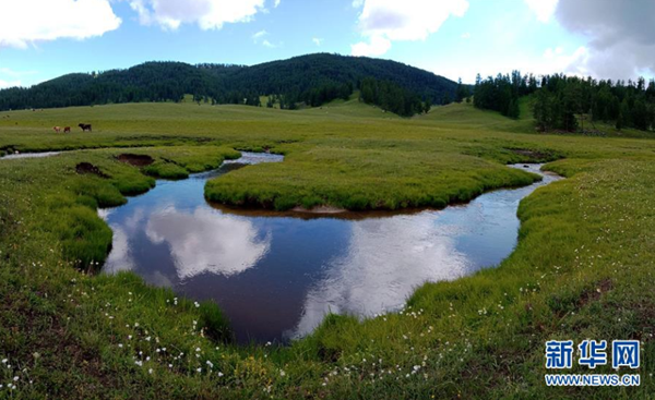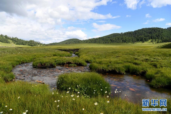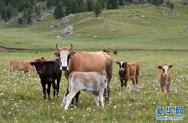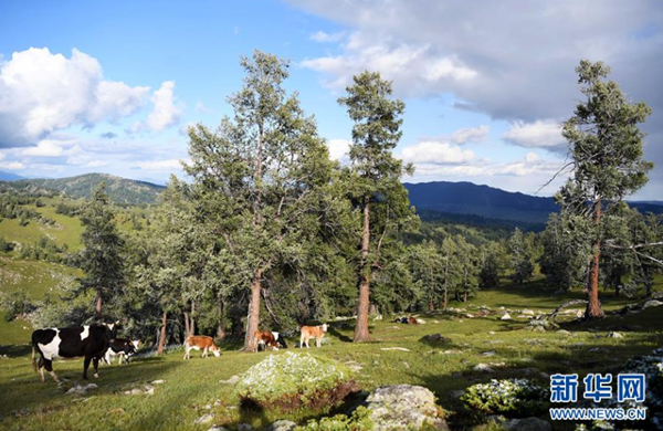 這是6月21日拍攝的新疆阿勒泰地區哈巴河縣的牧場風光。 夏日時節,新疆哈巴河縣薩爾布拉克鎮高山牧場水草豐茂,風景如畫。 新華社記者 沙達提 攝