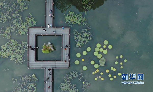 10月22日,游人在西湖小瀛洲島游玩(無人機照片)。 近日,隨著氣溫降低,杭州西湖初露秋色,顯出迷人風韻。 新華社記者 翁忻旸 攝