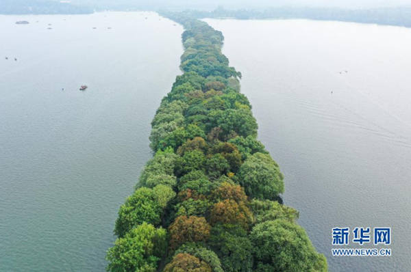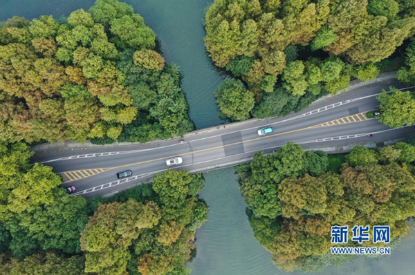 10月22日,機動車在西湖楊公堤上行駛(無人機照片)。 近日,隨著氣溫降低,杭州西湖初露秋色,顯出迷人風韻。 新華社記者 翁忻旸 攝