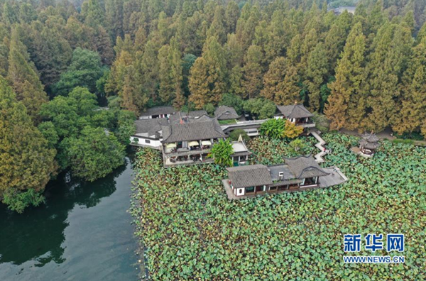 10月22日,西湖周邊的植被染上秋色(無人機照片)。 近日,隨著氣溫降低,杭州西湖初露秋色,顯出迷人風韻。 新華社記者 翁忻旸 攝