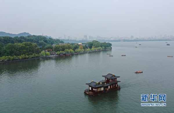 10月22日,游船在西湖上行駛(無人機照片)。 近日,隨著氣溫降低,杭州西湖初露秋色,顯出迷人風韻。 新華社記者 翁忻旸 攝
