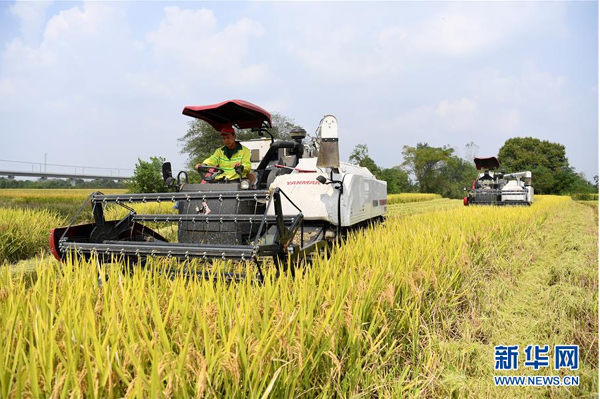 9月26日,花崗鎮河豐社區農民駕駛收割機收割水稻。 近日,安徽省肥西縣花崗鎮河豐社區水稻陸續成熟,當地農民搶抓晴好天氣收割水稻,力爭讓稻谷顆粒歸倉。 新華社記者劉軍喜攝