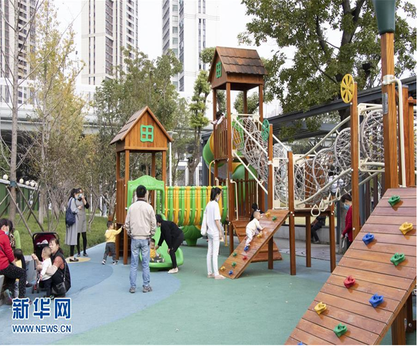 10月27日,家長帶著孩子在武漢市姑嫂樹“口袋公園”內玩耍。新華社發